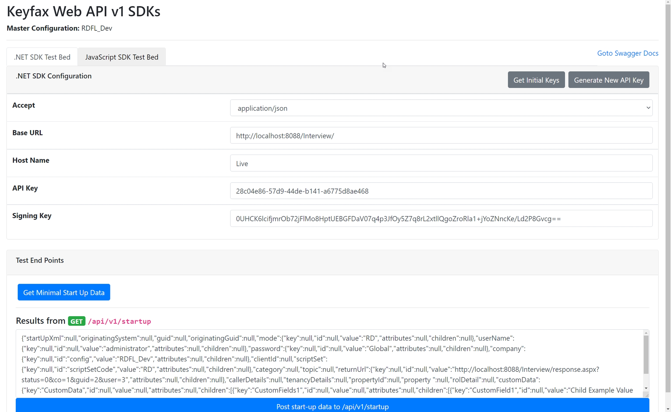 If you are working with Keyfax 4.3.3.0 or above you can point your development web browser to /Interview/Utilities/WebApi/. If you are running Keyfax locally this will present a page demonstrating both the .NET & JavaScript Web API SDK's. On this page you'll notice two tabs along the top - a ".NET SDK Test Bed" tab and a "JavaScript SDK Test Bed" tab. Developers working with the Keyfax Web API SDK's may find the code in these examples helpful. If you would like access to the SDK test page to assist with your integration please contact Omfax support.