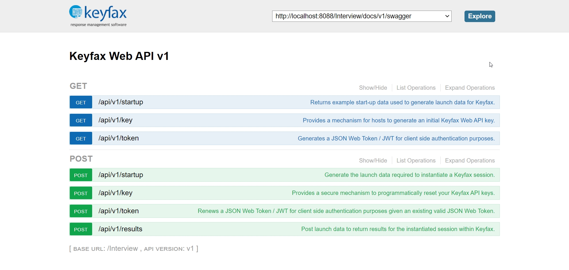 The Swagger UI API Explorer is available via /interview/swagger/index when running Keyfax locally. Further information on each of these end points is also provided below.