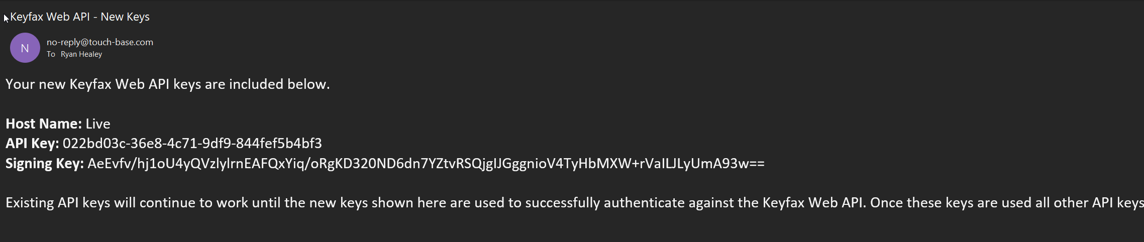 kfServerConfig.xmlfile for the supplied host Keyfax will generate and save a new API & signing keyKeyfax will respond with the new API key. The new signing key will be sent via email to the email address defined within