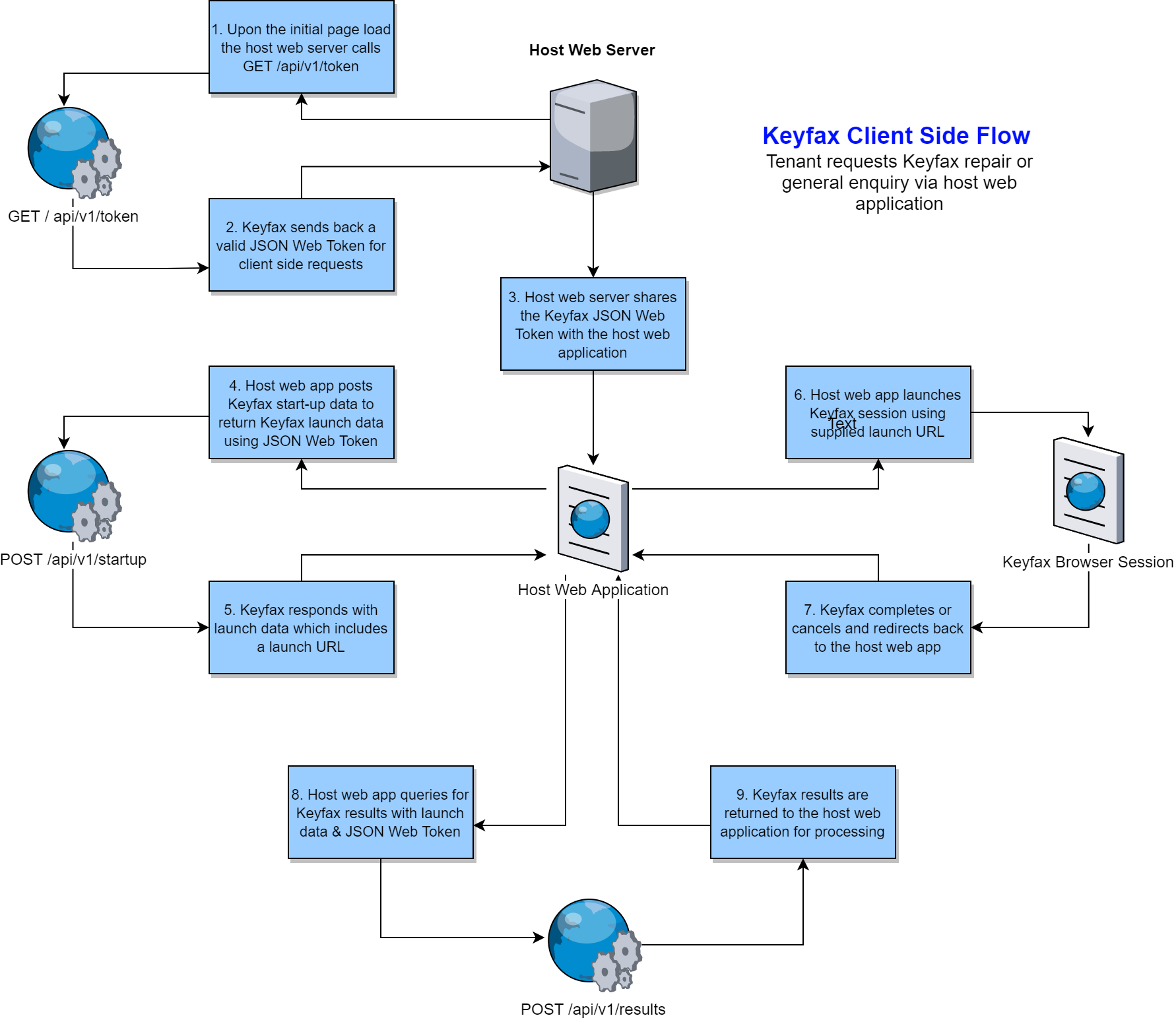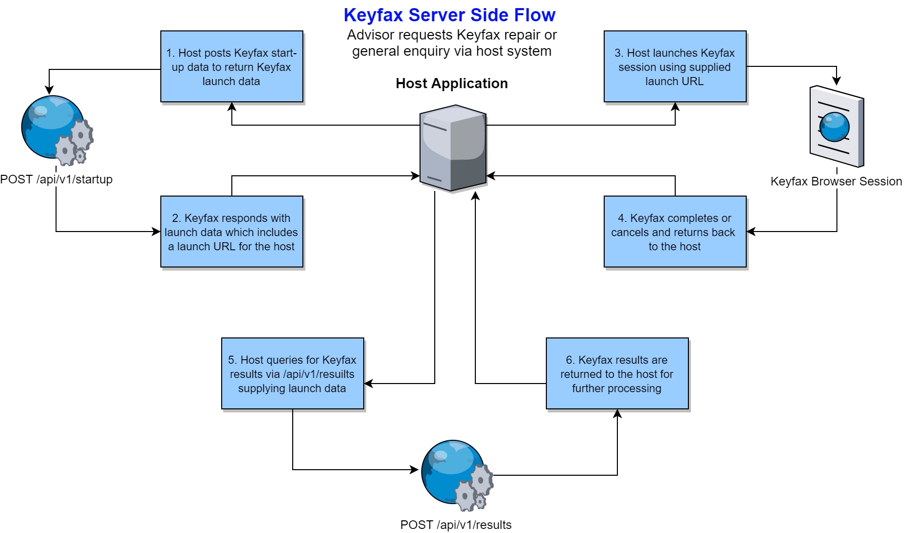 POST /api/v1/startupwith valid Keyfax start-up data and a validBasicauthorization schemaPOST /api/v1/startupresponds with launch data you can use to launch a new Keyfax sessionHost launches Keyfax using the returned launch URL