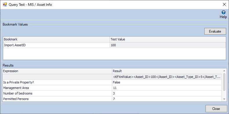 This will present a dialogue as shown below. In this example, you can see the DataBox **Import.AssetID** needs to be supplied; you should enter any test values and click **Evaluate**. In this case, **100** has been entered and in the **Results** section you can see the full result (which is provided in the form of an XML snippet) and the accompanying results of the Expressions:&#x20;