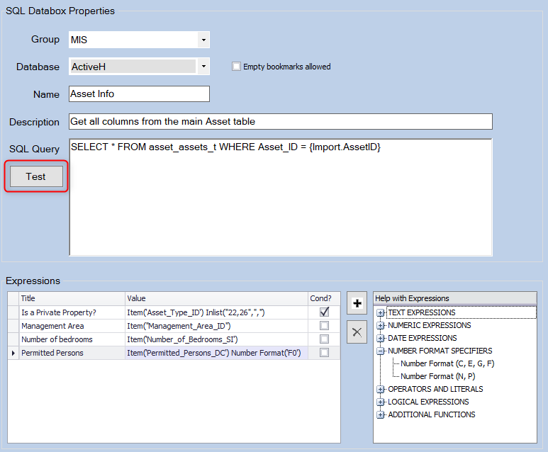 This is best shown in an example. Once your SQL is crafted and appropriate Expressions have been added, click the **Test** button. As the description says, this query will return all columns from an Asset table. A number of Expressions will test or retrieve the returned data.