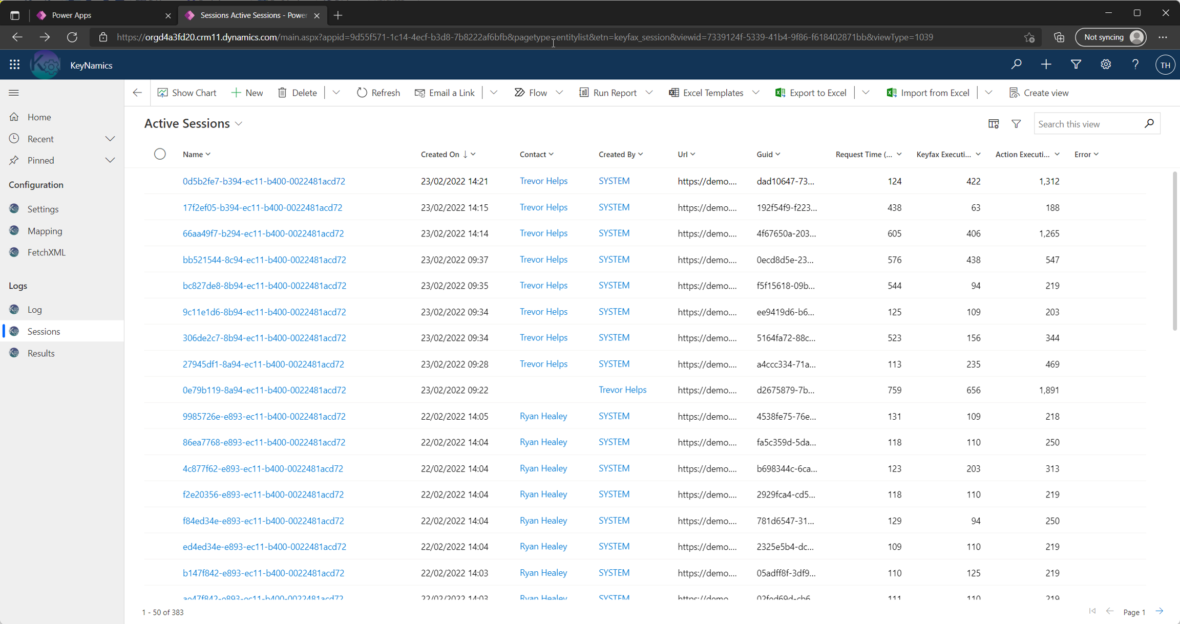 keyfax_session)When KeyNamics is launched an entry is always added to the keyfax_session entity within Dynamics to represent the users KeyNamics session. This provides the user launching KeyNamics with a global unique identifier to represent the session which is then used for subsequent requests to obtain session specific data. You can review all created KeyNamics sessions via the "Sessions" link available within the KeyNamics model driven app as shown below...