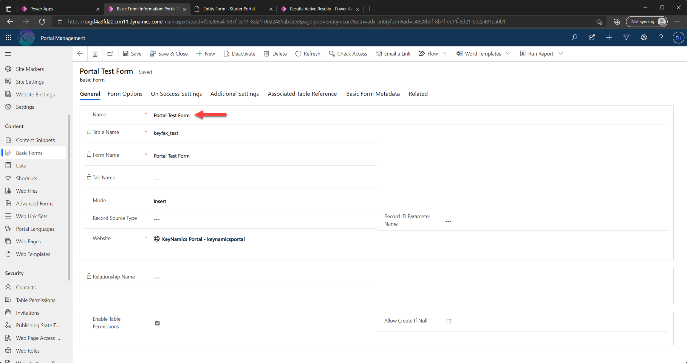 ` liquid tag. The name supplied here matches the name of our Basic Form within the portal as shown below...