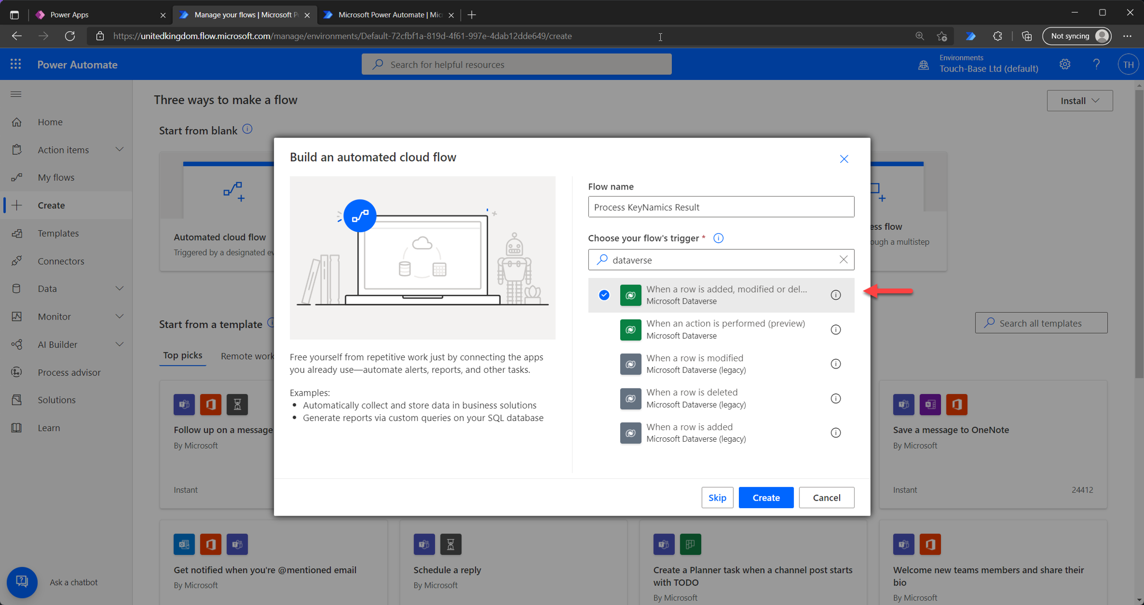 Provide a name for your flow. For the trigger choose "When a row is added, modified or deleted" for Microsoft Dataverse. This is shown below...