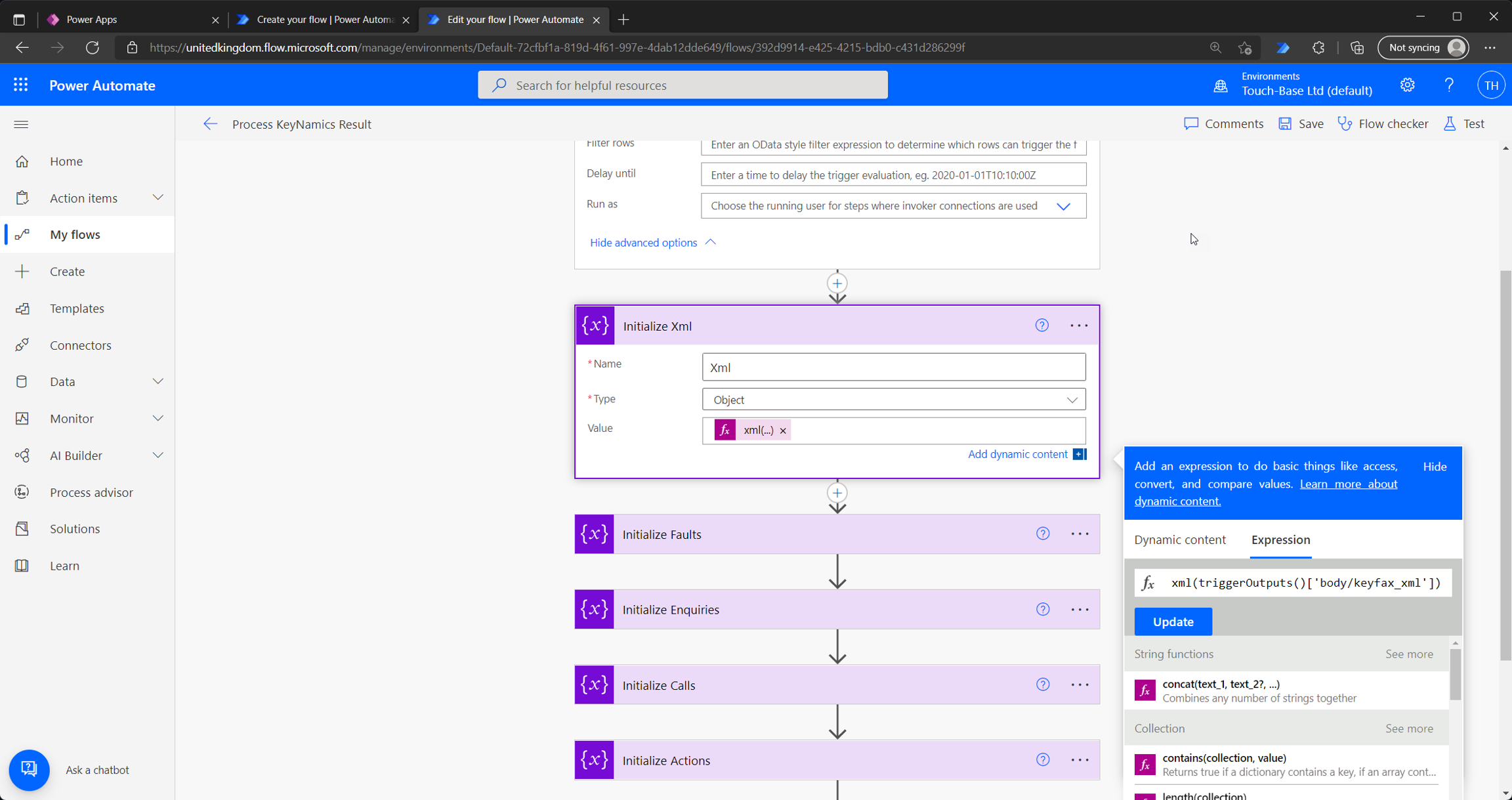 The expression for this variable is xml(triggerOutputs()['body/keyfax_xml']). Within the flow we can now refer to this variable and execute XPath expressions against this XML to iterate with the XML or pull out specific elements.