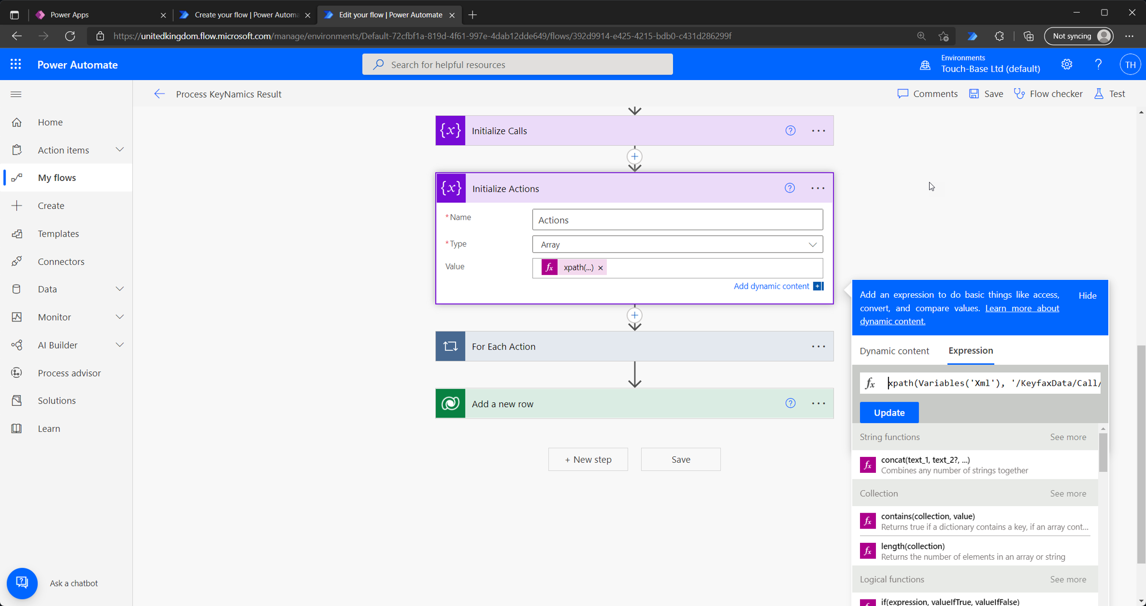 The expression for this variable is xpath(Variables('Xml'), '/KeyfaxData/Call/Action')