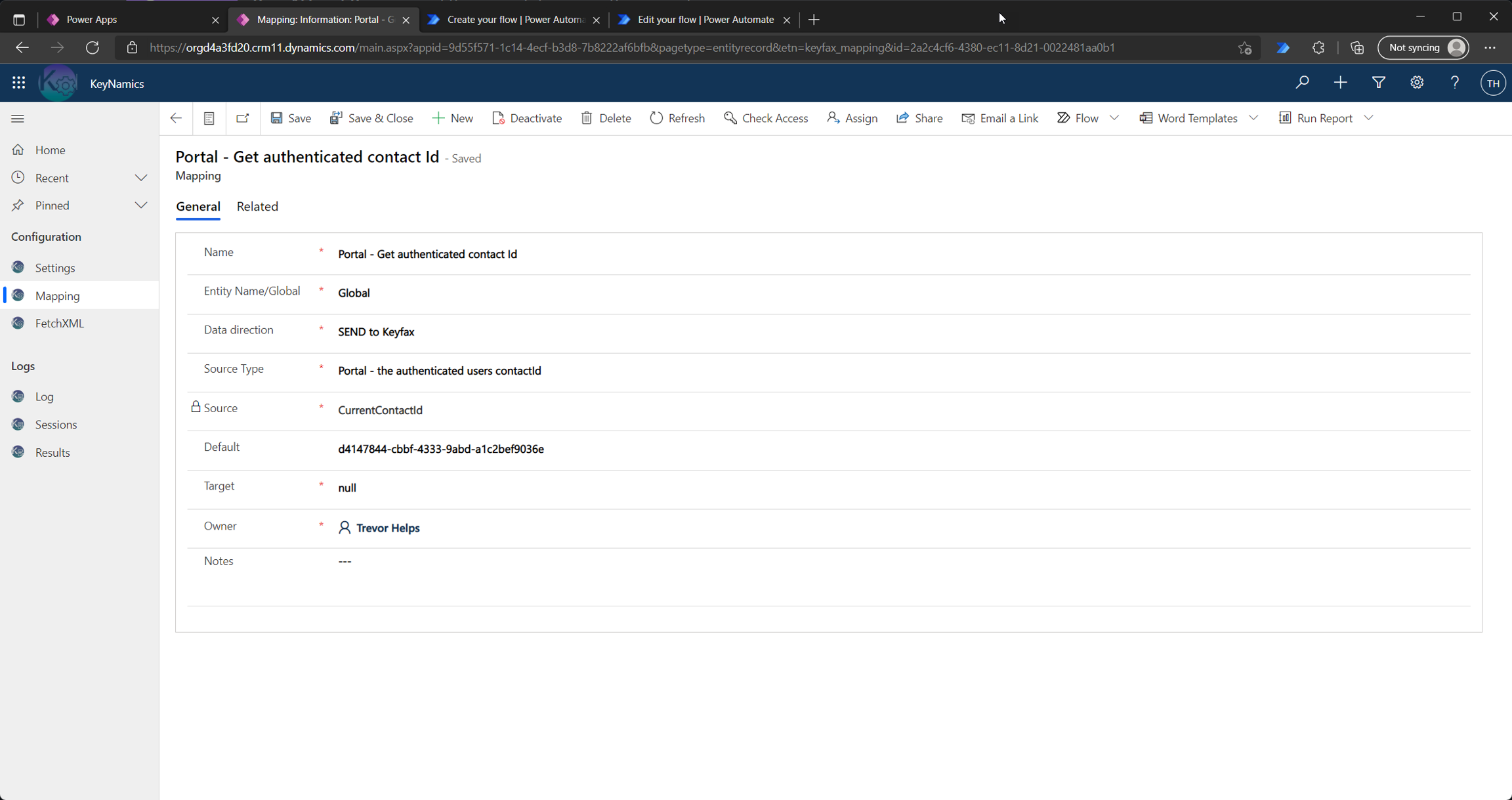 In addition to using field mappings to update entities within Dataverse with results from Keyfax portal administrators can also leverage Power Automate Flows to perform additional post-processing of Keyfax results. For further information on this please refer to the "Using Power Automate Flows to process Keyfax results" section of this guide.